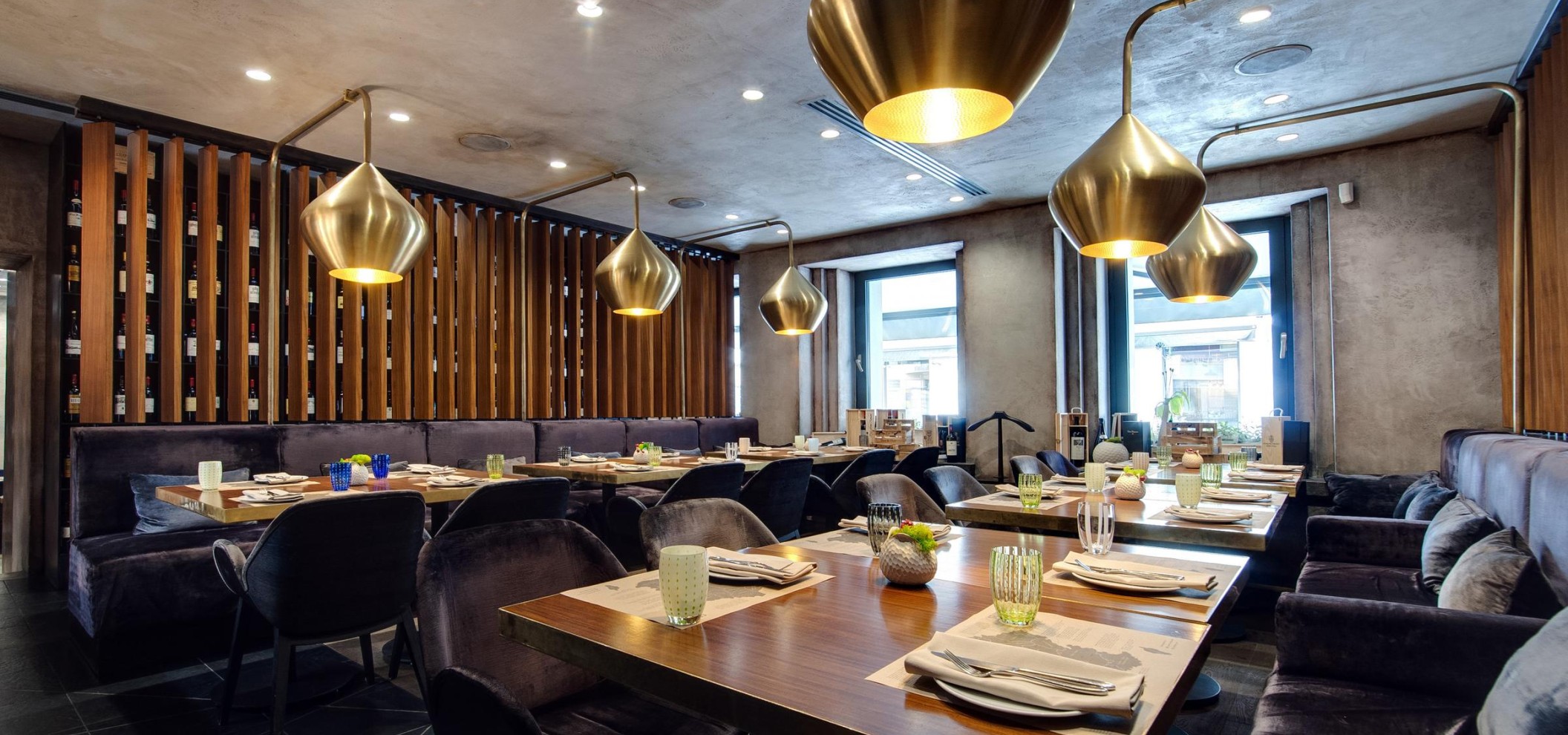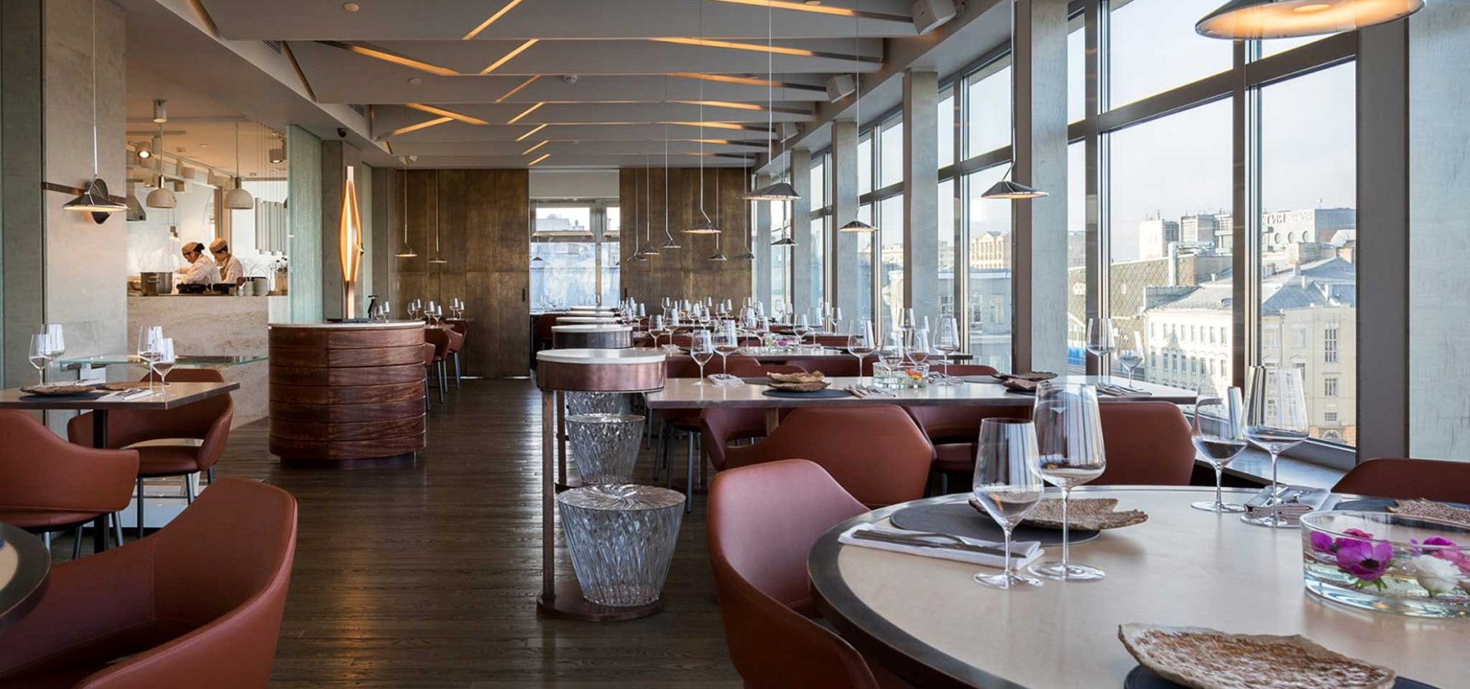 餐厅以本地时令食材打造7–12道菜的品鉴套餐,如远东帝王蟹、阿尔泰羊羔肉、野生酱料等。室内设计融合了极简风格与温暖色调,夏季设有俯瞰市中心的露台。