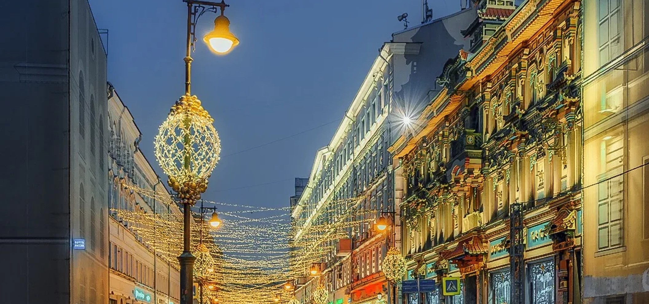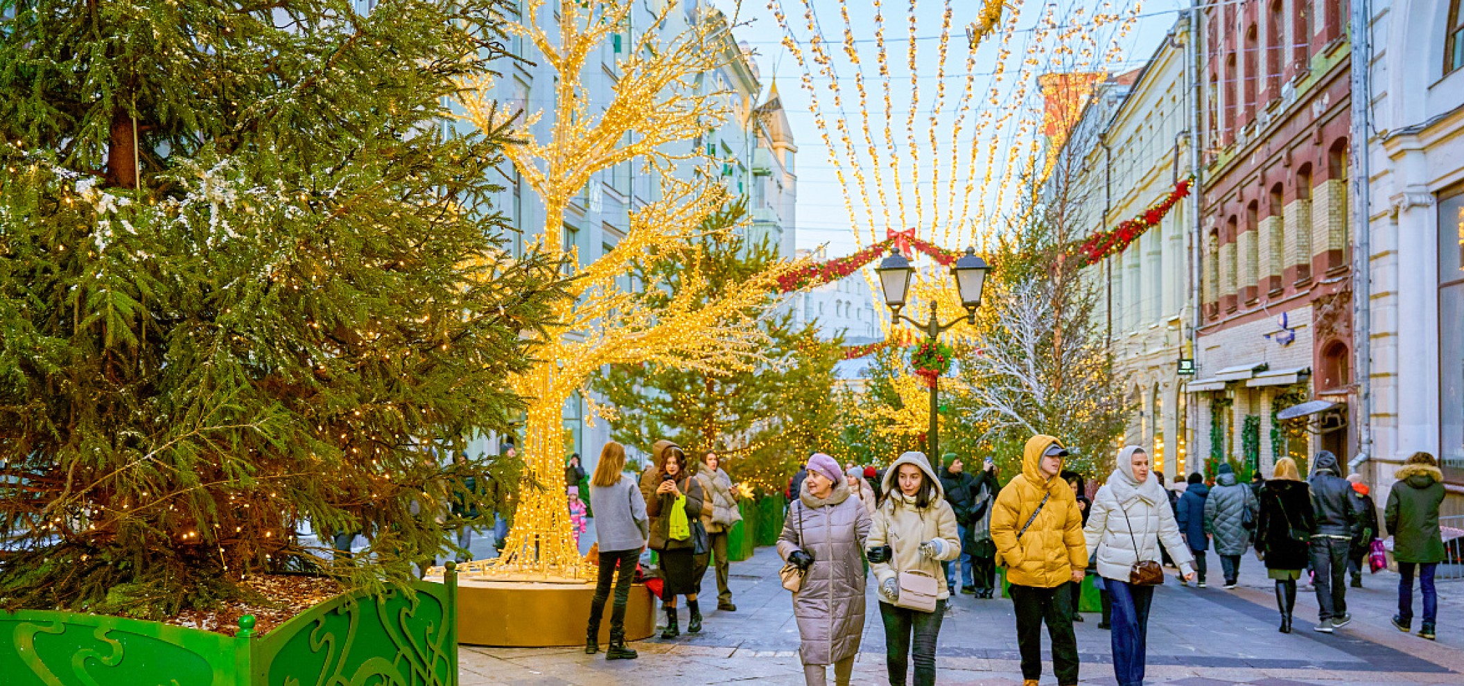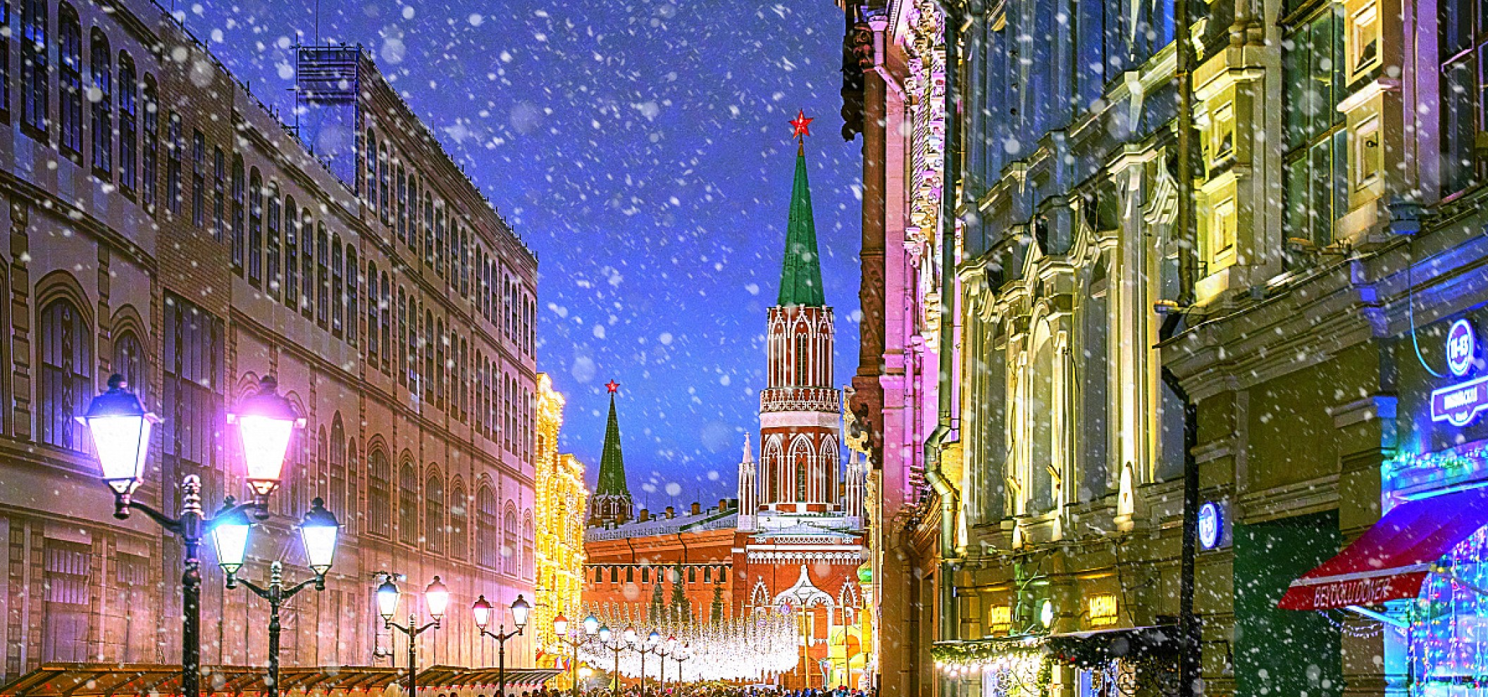 傍晚时分,街道上空亮起彩灯串,酒吧和餐馆纷纷开门迎客。尼科利斯卡亚街 (Nikolskaya Street) 是莫斯科节日氛围最淋漓尽致的体现。