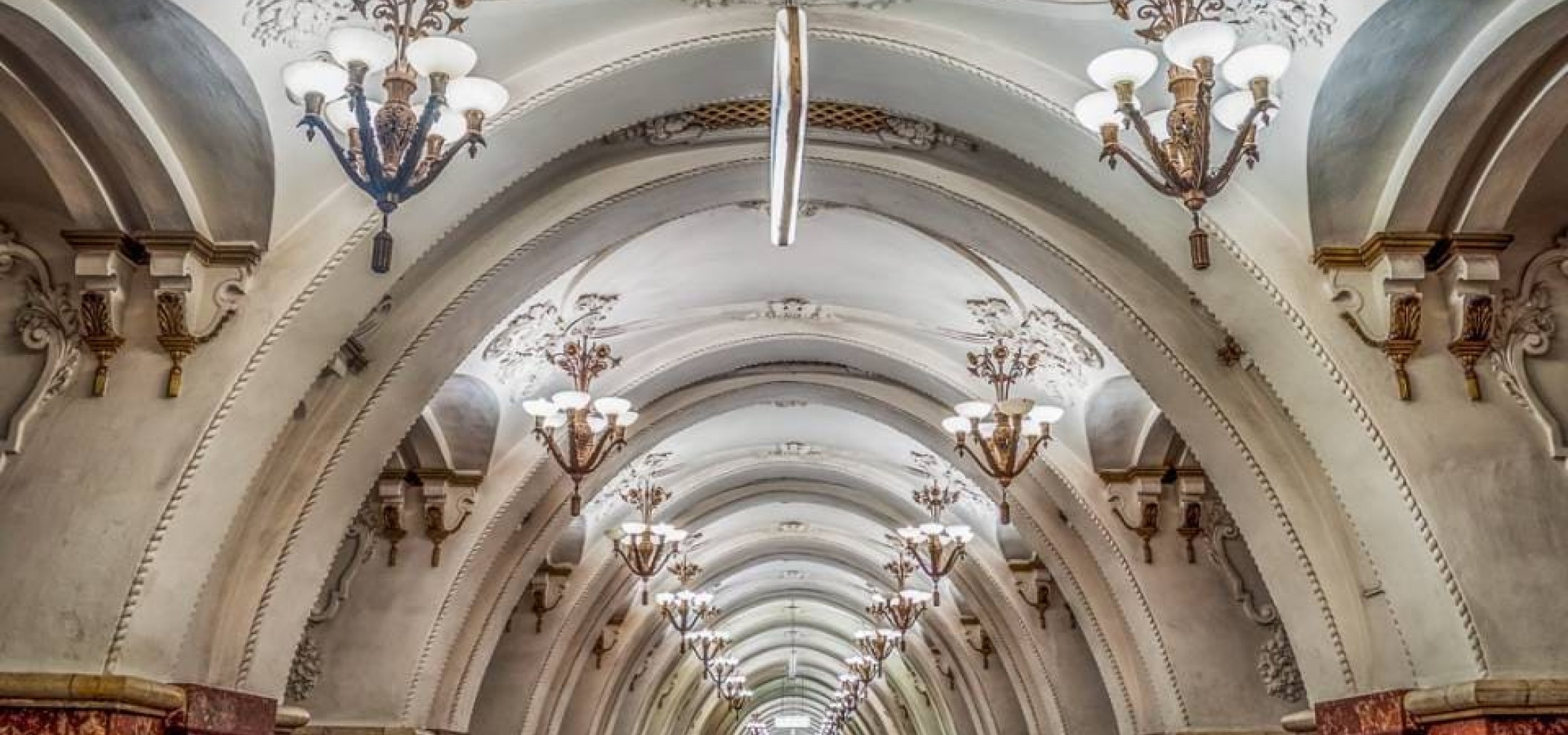 镀金吊灯让站台宛若宫殿华厅,玫瑰色大理石柱面与奶油色釉面瓷砖墙面相得益彰,构成该时期车站的经典配色。