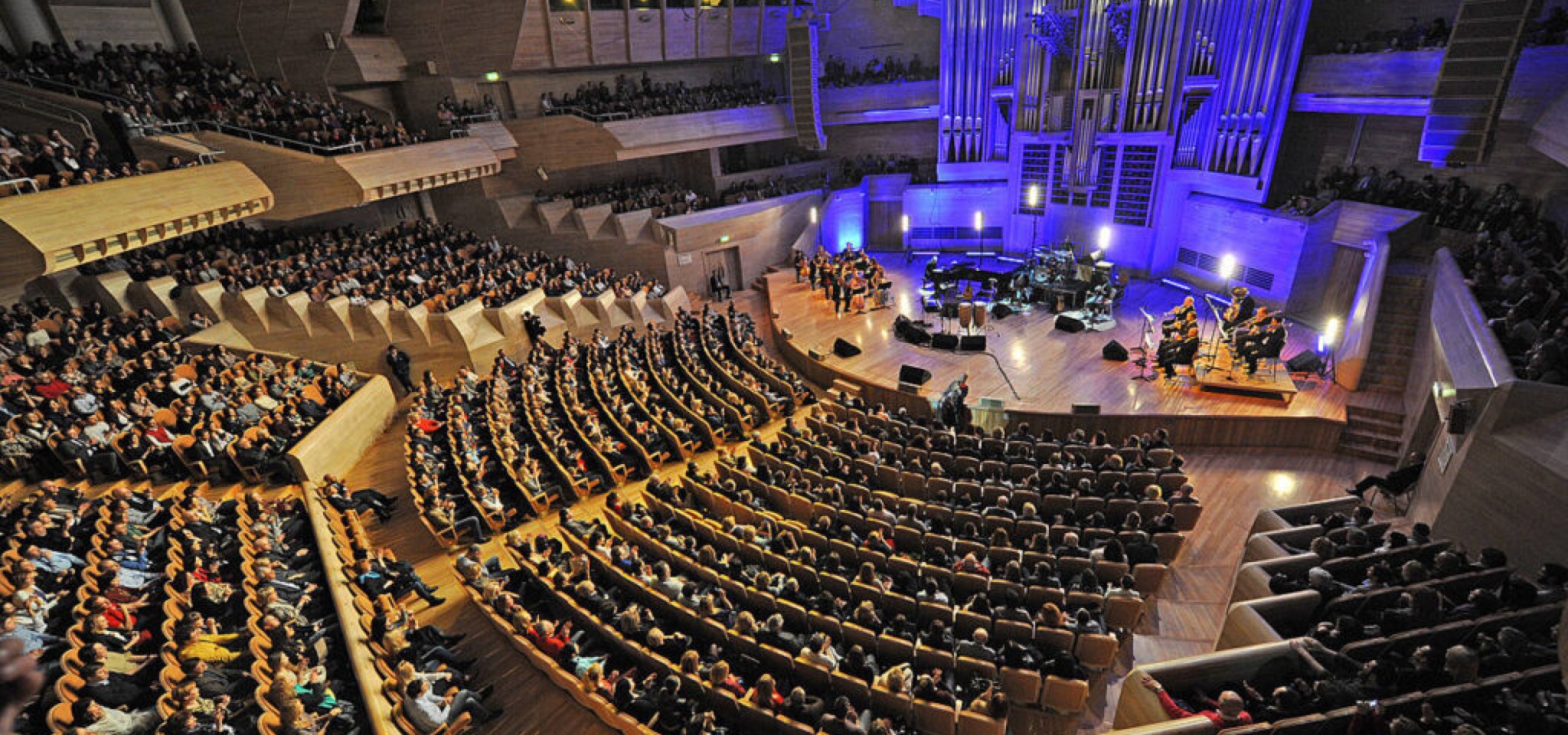 波浪形玻璃屋顶与立面设计引入充足自然光线。窗外可欣赏莫斯科河与中国城大街美景。设有两个音乐厅:大音乐厅是俄罗斯唯一的可变形厅,容纳1600人,池座可升高2.5米或完全收起形成大型舞台,配备先进音响系统,音质纯净清晰;小音乐厅容纳400人,更适合室内乐演出。节目单与购票请见音乐厅官网。