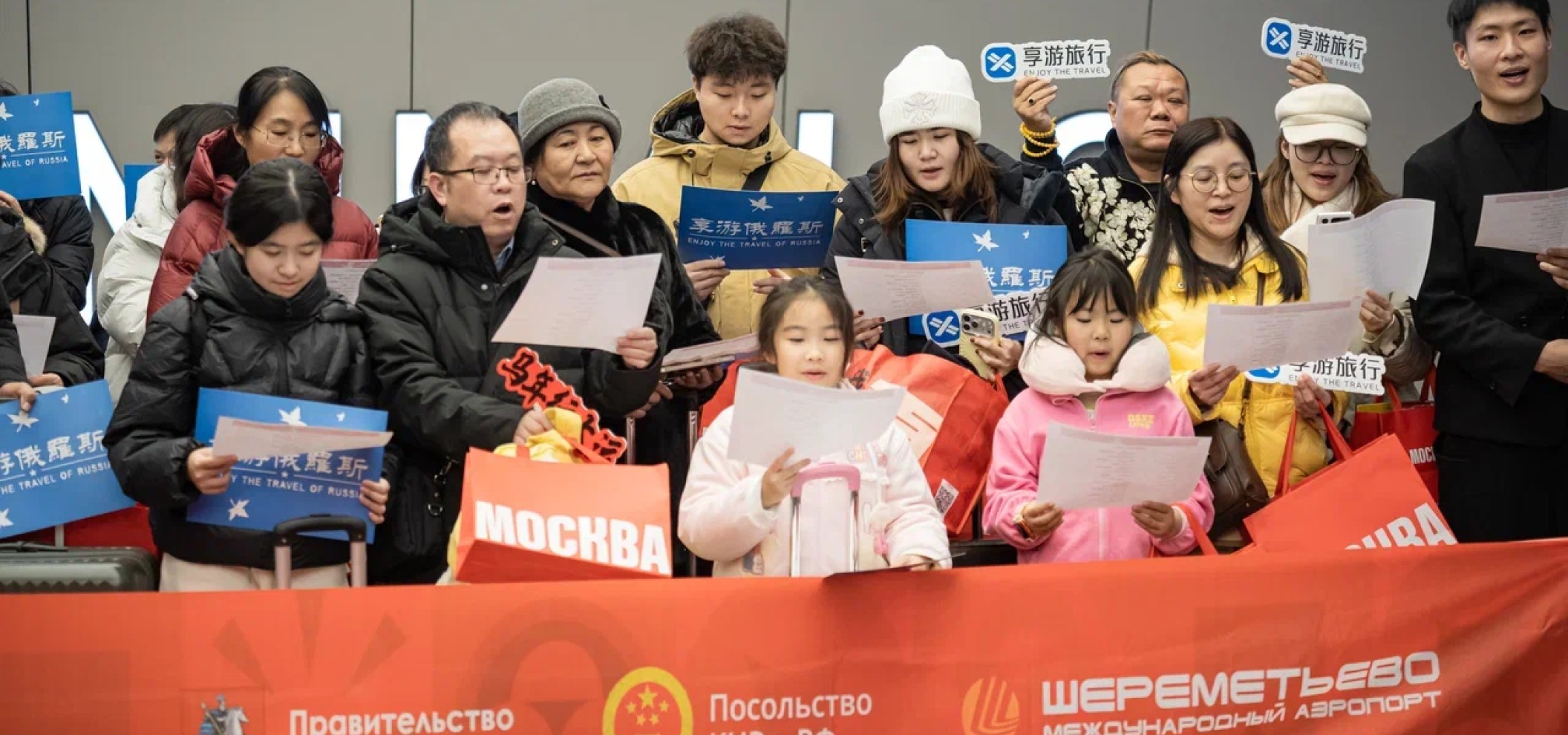 在谢列梅捷沃国际机场 (Sheremetyevo International Airport),来自广州的首批旅游团之一受到了热烈欢迎。旅行者们不仅遇到了乐手们的现场演奏,还获赠了纪念礼物,营造出浓浓的节日气氛。