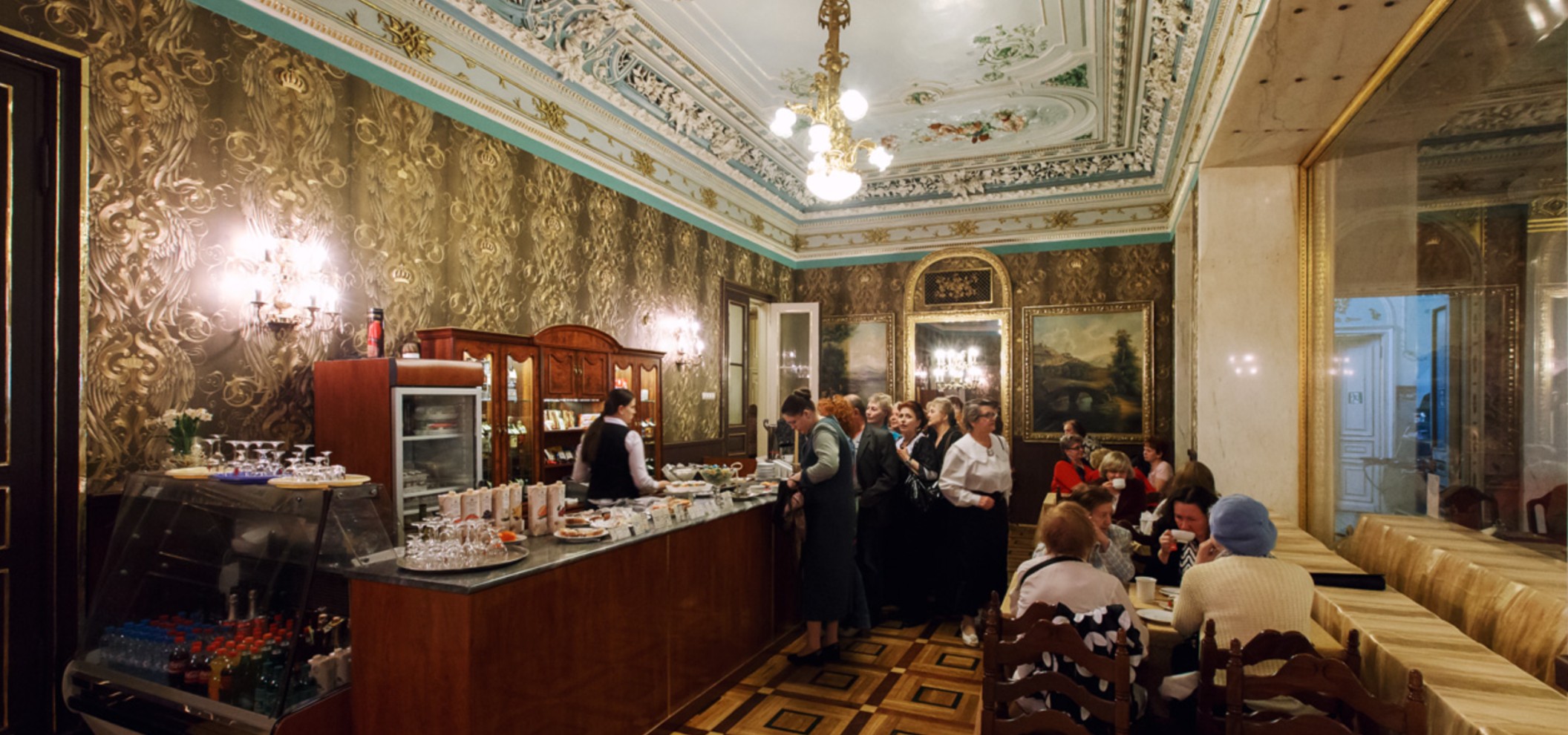 这家自助餐厅于1922年开业,是目前仍可品尝传统苏联菜肴的地方,坐落在一个拥有大理石柱和威尼斯玻璃的豪华建筑中。