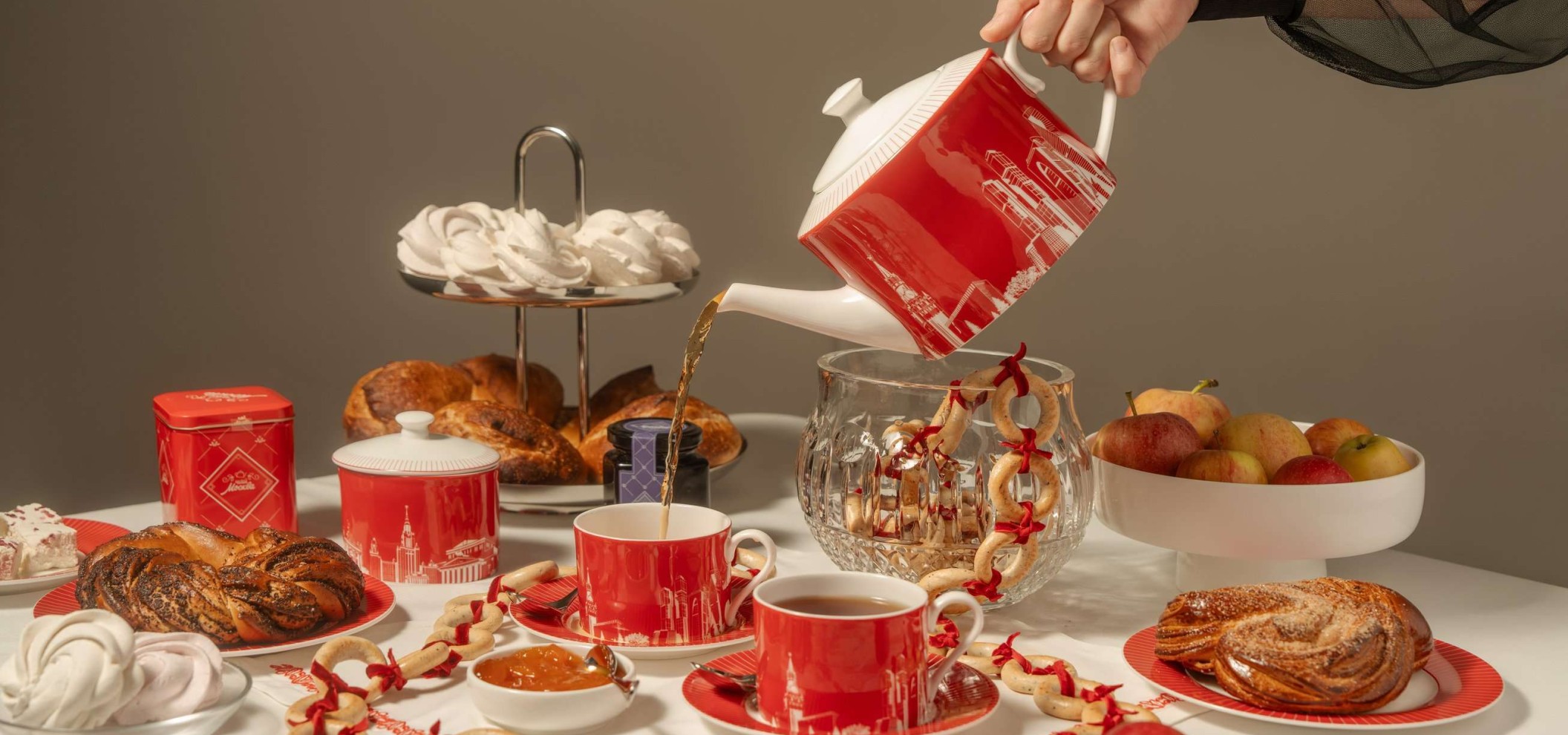 红色背景赋予茶具独特的个性:温暖、自信、灵动且充满节日感,正如莫斯科本身,总是以微笑和款待迎接宾客。瓷器轻薄清脆,釉面泛着柔和光泽,造型经过精心设计,兼具现代感。