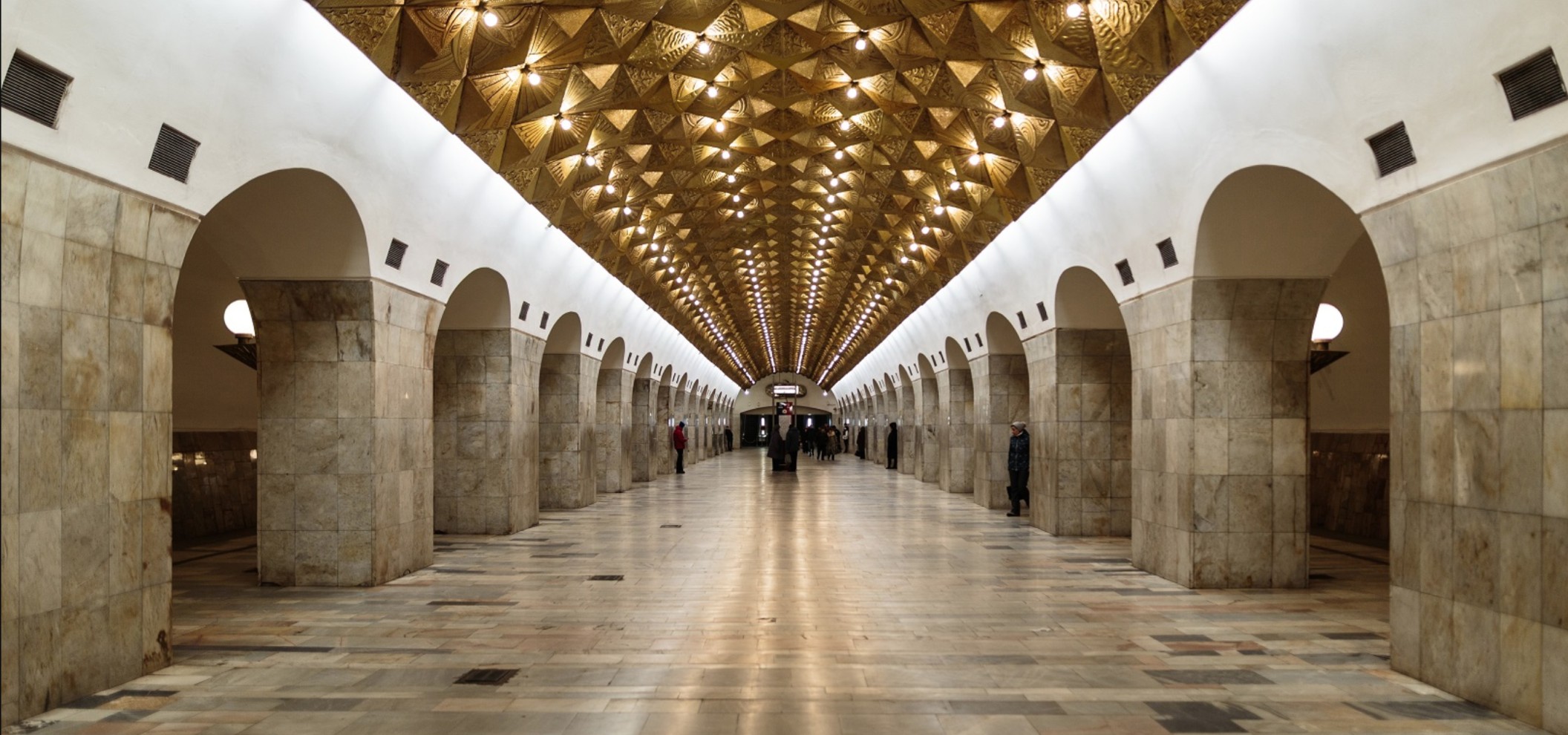 这是莫斯科地铁的第一座“宇宙”车站。它的墙面上装饰着十幅浮雕壁画,造型由艺术家拉季金设计。这些作品描绘了人类对宇宙的设想——从古老的神话到探索宇宙的第一步。