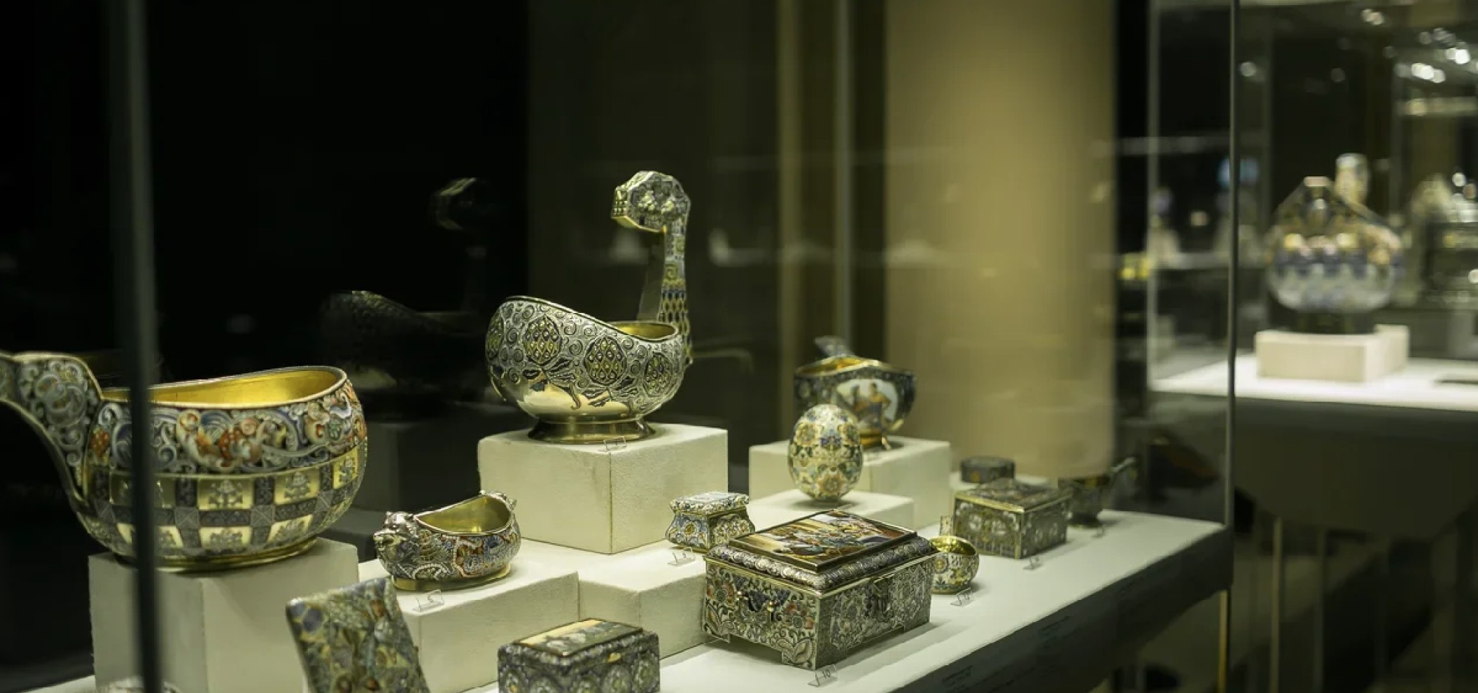 18至20世纪初的法贝热、奥夫奇尼科夫、赫列布尼科夫等珠宝匠的作品占据一席之地。此前未在莫斯科展示过的部分纳雷什金宝藏亦成为项目的一部分。俄式与欧式瓷器则以系列盛宴餐具为代表,其中包括著名的"拉斐尔系列",该系列由亚历山大三世委托制作,灵感源于梵蒂冈凉廊的壁画。