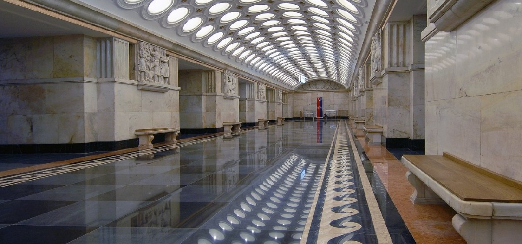 地面最初铺设的是棋盘格纹大理石,侧面饰有波浪纹。2007-2008年重建期间,地面被替换为花岗岩,完全沿用了棋盘格纹。车站尾部曾装饰有约瑟夫·斯大林侧面像的圆形徽章,但在赫鲁晓夫时期被拆除。