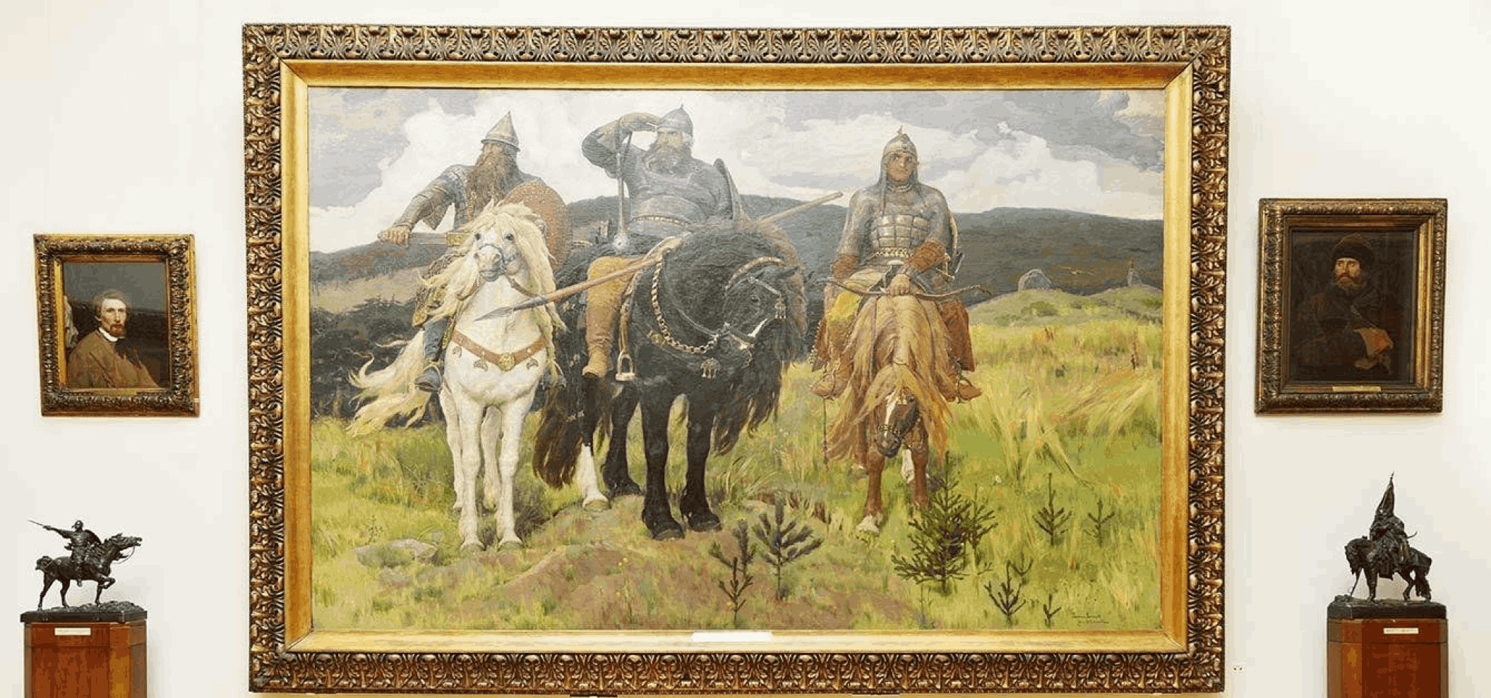 瓦斯涅佐夫的这幅鸿篇巨制,描绘了俄罗斯史诗中三位传奇英雄:伊利亚·穆罗梅茨、多布雷尼亚·尼基季奇和阿廖沙·波波维奇。画作象征着俄罗斯大地的力量与守护。