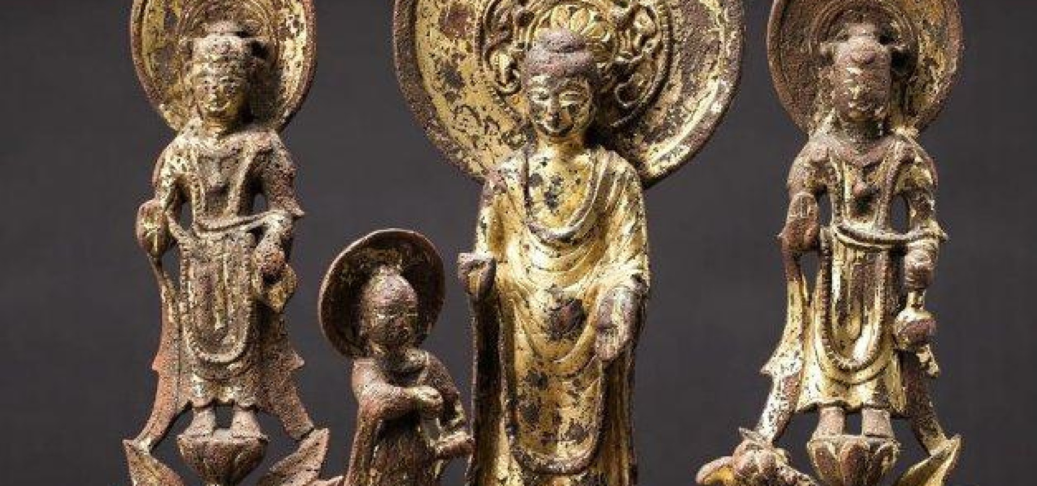 一件罕见的公元六世纪文物,产于中国北朝时期。佛坛中央雕刻着一尊站立的佛像,两侧是手持圣物的菩萨:一个水罐和一个香炉。这种便携式佛坛是朝圣者和传教士在无法建造寺庙的时期进行宗教仪式时使用的。
