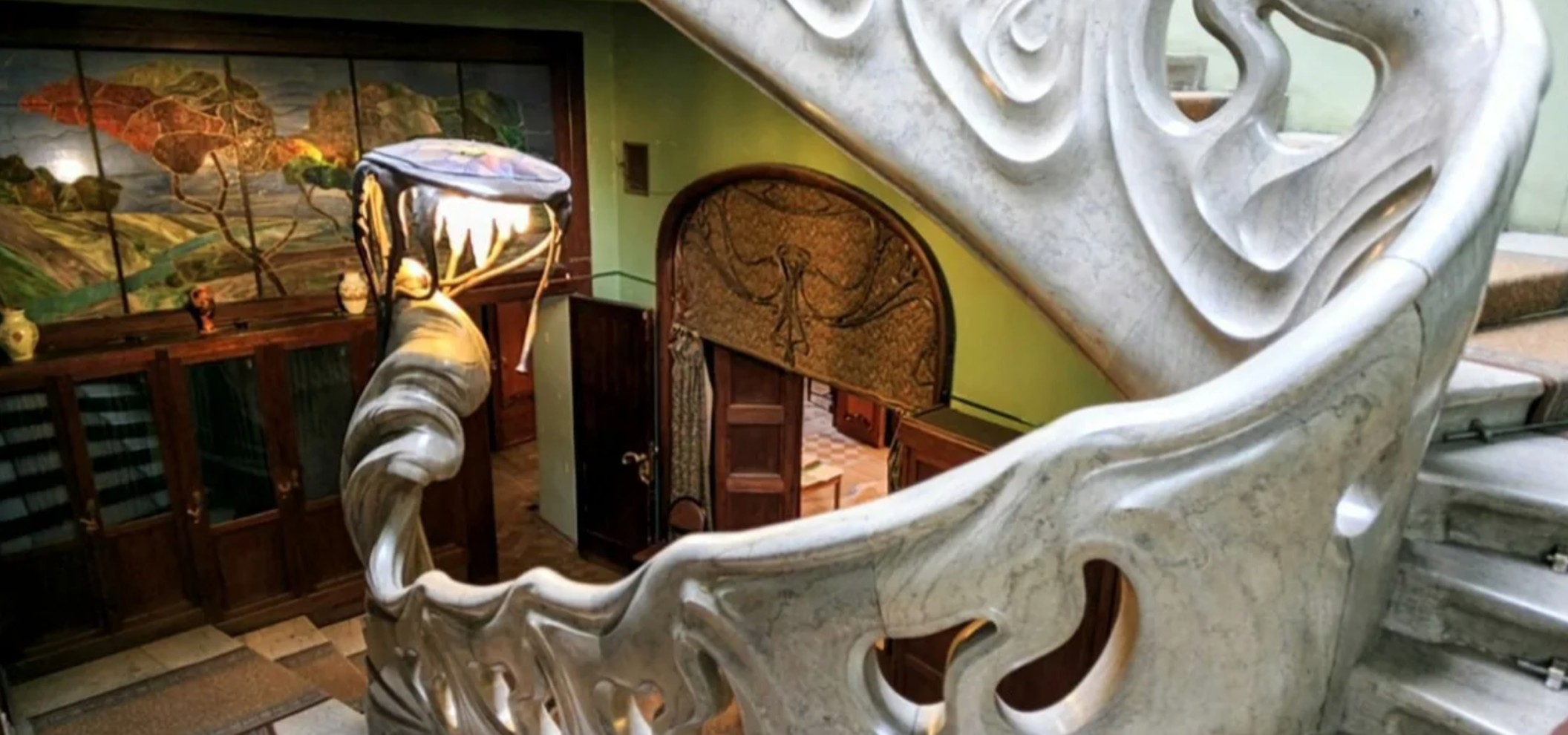 特别令人感兴趣的是著名的波浪楼梯,它是房子的核心元素。它象征着生命的运动,并有机地融入水元素的整体概念,这在设计细节中可见一斑。房屋的装饰还带有百合、蜻蜓、蝾螈、海龟和海马的图案,进一步强调了自然主题。