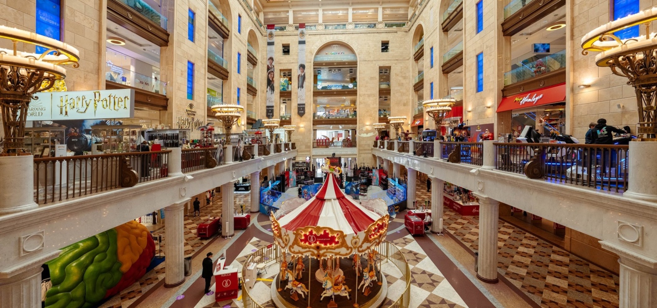 商场内有100多家儿童商品商店,包括玩具、服装、书籍,以及娱乐区:游乐场、“童年”博物馆和电影院。屋顶设有观景台,可俯瞰莫斯科市中心。商场内还设有咖啡馆和餐厅。