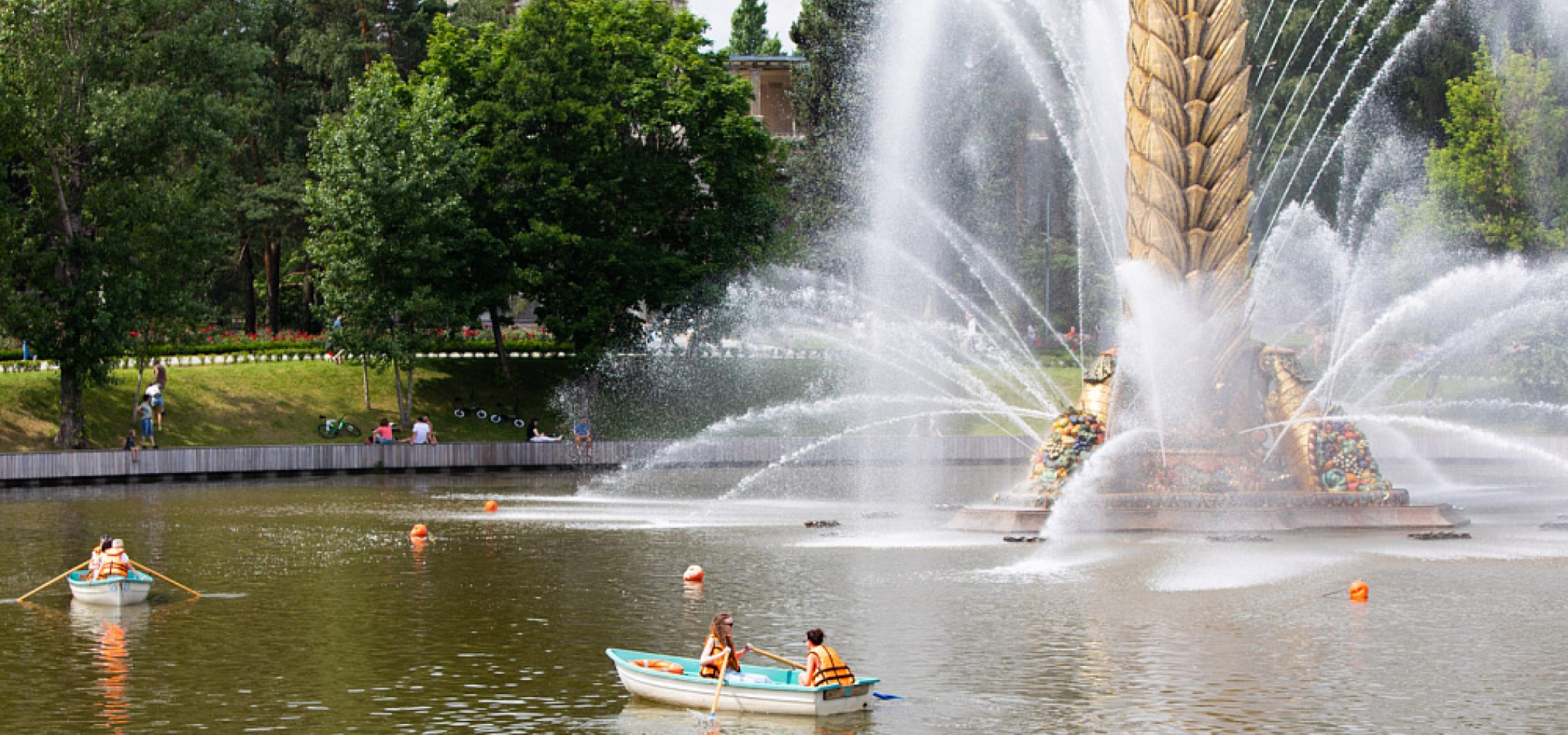 VDNKh 为游客提供了一个独特的机会,在风景如画的池塘上乘船从水上欣赏展览的主要景点。中央池塘(主池塘)是展览馆的核心,早在 1939 年全联农业展览会开幕时就已建成。